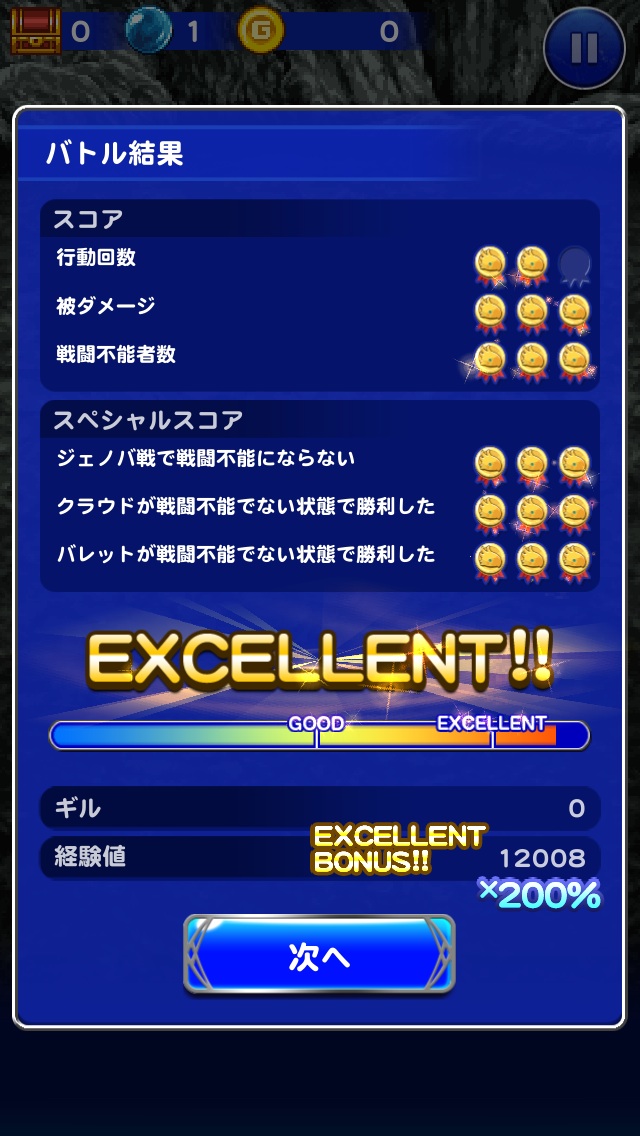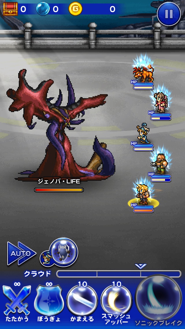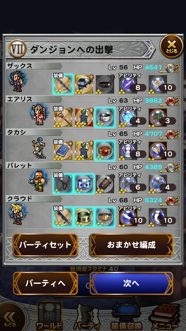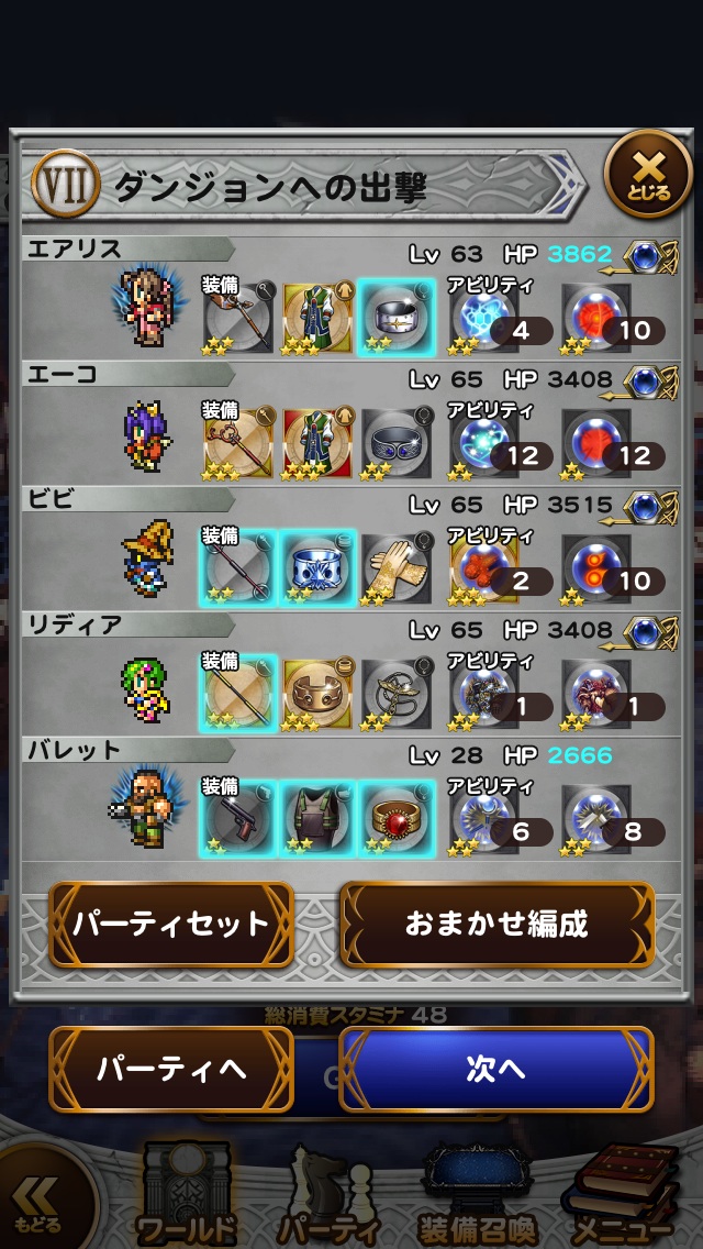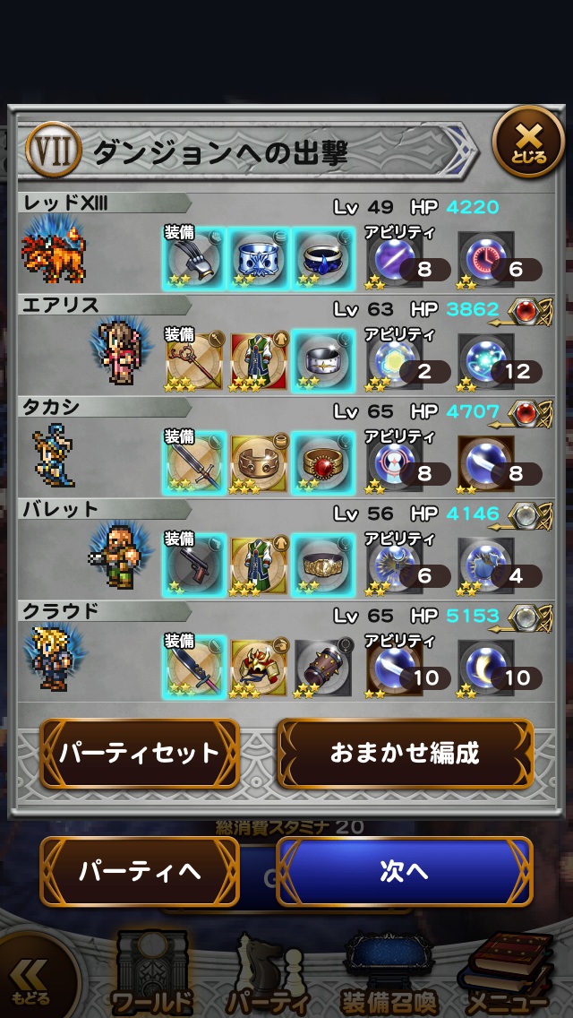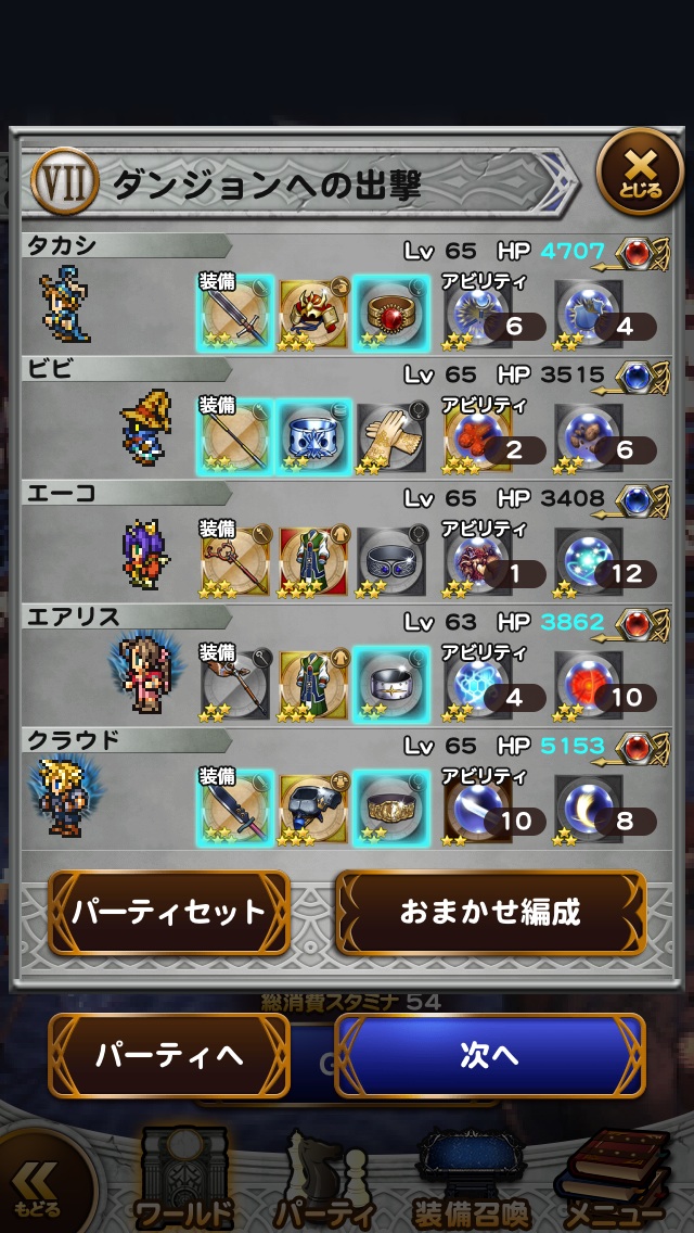 ☆レコードマテリア■主人公・・・ソルジャーの誇り■ビビ・・・魔力の泉Ⅱ■エーコ・・・召喚の泉Ⅱ■エアリス・・・精神統一Ⅱ■クラウド・・・ソルジャーの一撃☆使用必殺技■主人公・・・鉄壁のグリモア■ビビ・・・ためる(魔力)☆フレンド召喚■まふうけん(2回)