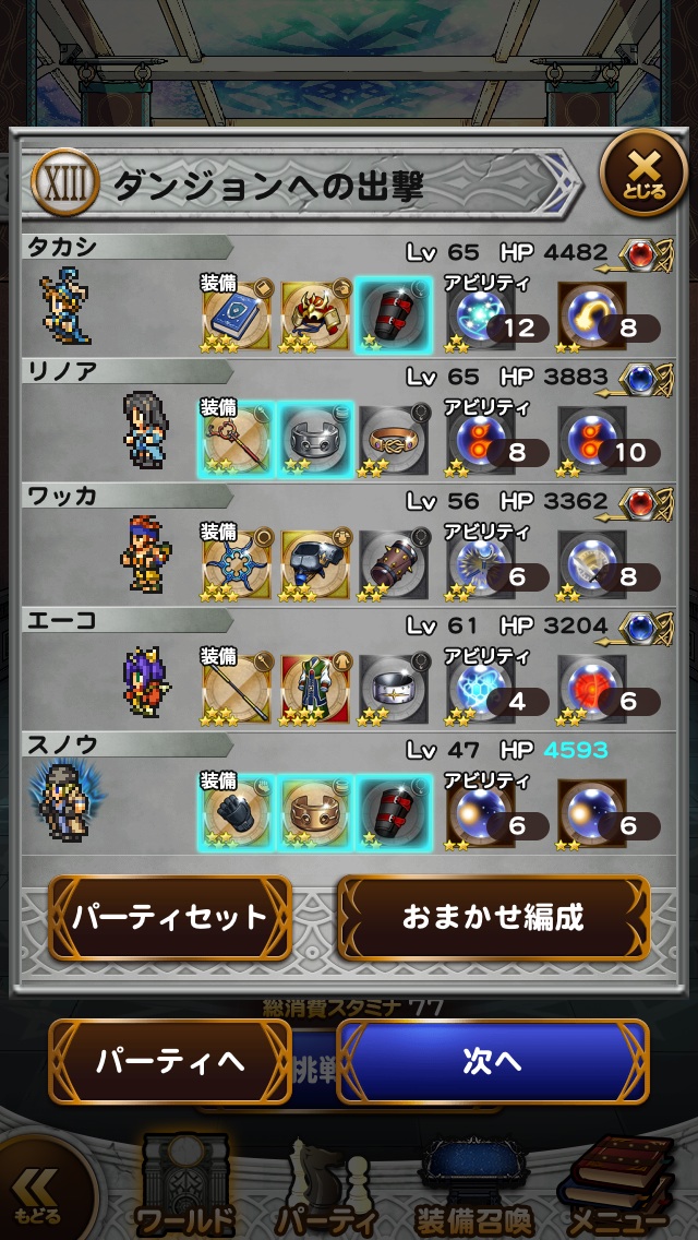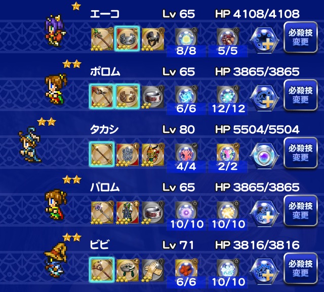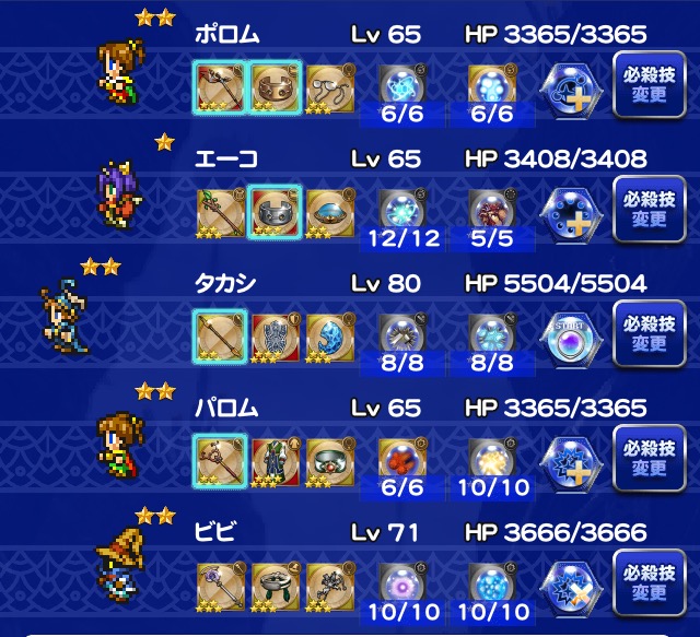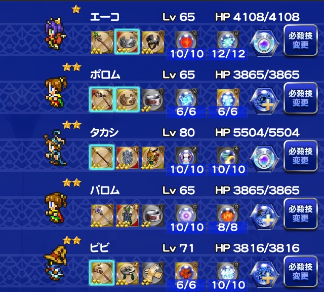 ☆レコードマテリア■ライトニング・・・ソルジャーの一撃■主人公・・・精神統一Ⅱ■サッズ・・・みだれうちチャンス☆必殺技変更■ライトニング・・・マインドアップ■マリア・・・サンダートラップ■主人公・・・鉄壁のグリモア☆フレンド召喚■グッドタイム(2回)