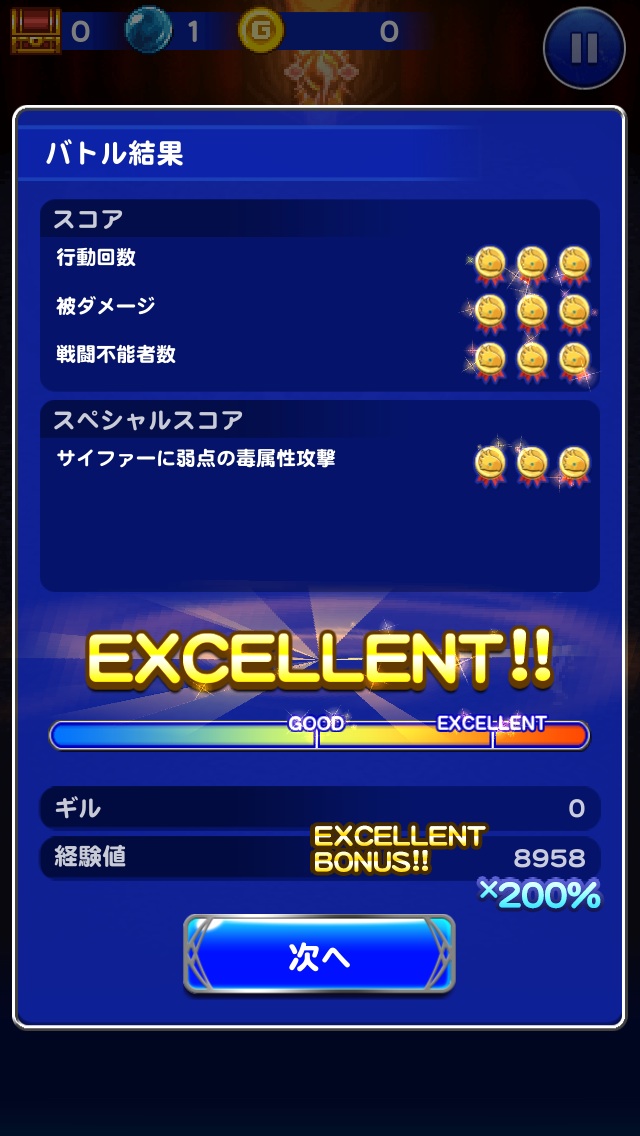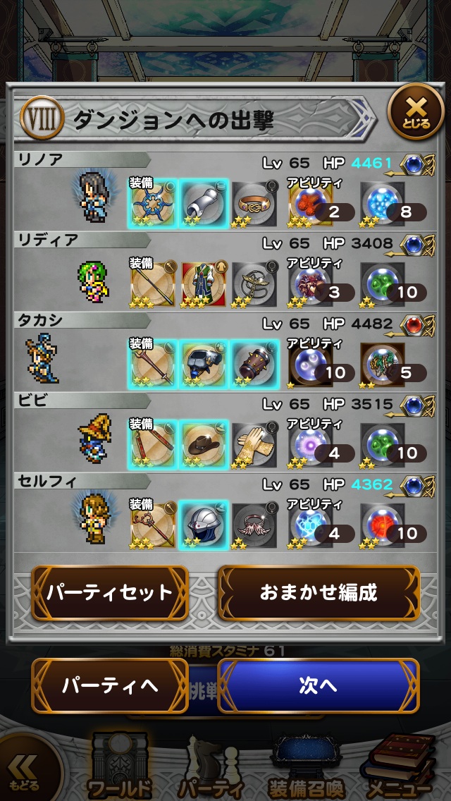 ☆レコードマテリア■リノア・・・専念■ガーネット・・・召喚の泉Ⅱ■主人公・・・ソルジャーの一撃■ビビ・・・魔力の泉Ⅱ■セルフィ・・・精神統一Ⅱ☆使用必殺技■ビビ・・・ためる(魔力)☆フレンド召喚■グッドタイム(2回)■難易度:85